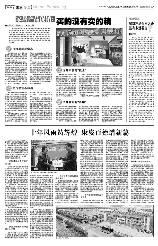 在康姿百德公司成立10周年之際,《中國消費者報》2014年4月18日C2版,用1/2的版面對康姿百德公司10年來的發(fā)展情況進行了客觀系統(tǒng)的報道。