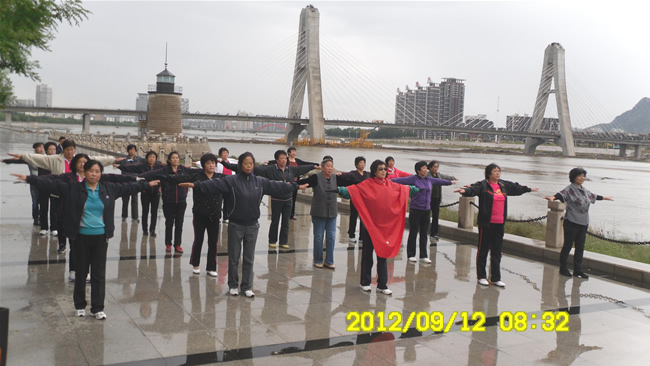 2012年9月12日,天空下著蒙蒙細雨,在遼寧朝陽大凌河畔照例響起了動感的音樂,伴隨著節(jié)奏,有這樣一群中老年人,時而胳膊上揚,時而屈腿下蹲,時而左右擺動,時而前后擊掌……他們在干什么?下雨天不是應該躲在家里看看電視、搓搓麻將、打打撲克嗎?為什么他們卻冒雨在明快節(jié)奏中舞動…… 原來,這是一隊康姿百德健身操愛好者。近日,不管是炎炎烈日下,還是蒙蒙細雨中,都從不間斷練習。2012年8月8日《中國體育報》刊登了一則新聞,報道將于9月23日舉辦全國康姿百德健身操精彩展演活動??吹竭@則消息后,遼寧朝陽的康姿百德健身操愛好者們就踴躍報名,組建隊伍精心備戰(zhàn)。參賽者們不僅參加每天晚上集體的健身操活動,并且還要每天堅持2個小時的集訓。在集訓指導老師分解動作教學后,這些參賽者更是信心倍增。 9月12日,從夜間到清晨雨水不斷,但是上午8時,參賽者們卻依然頂著雨打著傘來到了訓練場地,因為打傘練操不方便,阿姨們放下傘頂著雨一遍一遍的做著重復的動作,只為把每一個動作做得更好。只要音樂不停,即使雨再大,她們的動作也不會停止。隊員們有一個共同的信念:展示最美朝陽人。 對于參加這次健身操比賽,隊員們的態(tài)度都很積極,這是她們代表朝陽人第一次走出去,名次雖不重要,但要展現(xiàn)出朝陽人的風采,展現(xiàn)出自己最好的一面。