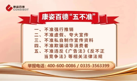 康姿百德制定了嚴(yán)格的“五不準(zhǔn)”原則,要求全國所有專賣店在醒目位置公示,接受社會監(jiān)督?!拔宀粶?zhǔn)”包括:不準(zhǔn)強(qiáng)行推銷;不準(zhǔn)虛假、夸大宣傳;不準(zhǔn)私自制作宣傳資料;不準(zhǔn)欺騙誤導(dǎo)消費(fèi)者;不準(zhǔn)違反《廣告法》《反不正當(dāng)競爭法》等相關(guān)法律法規(guī)。